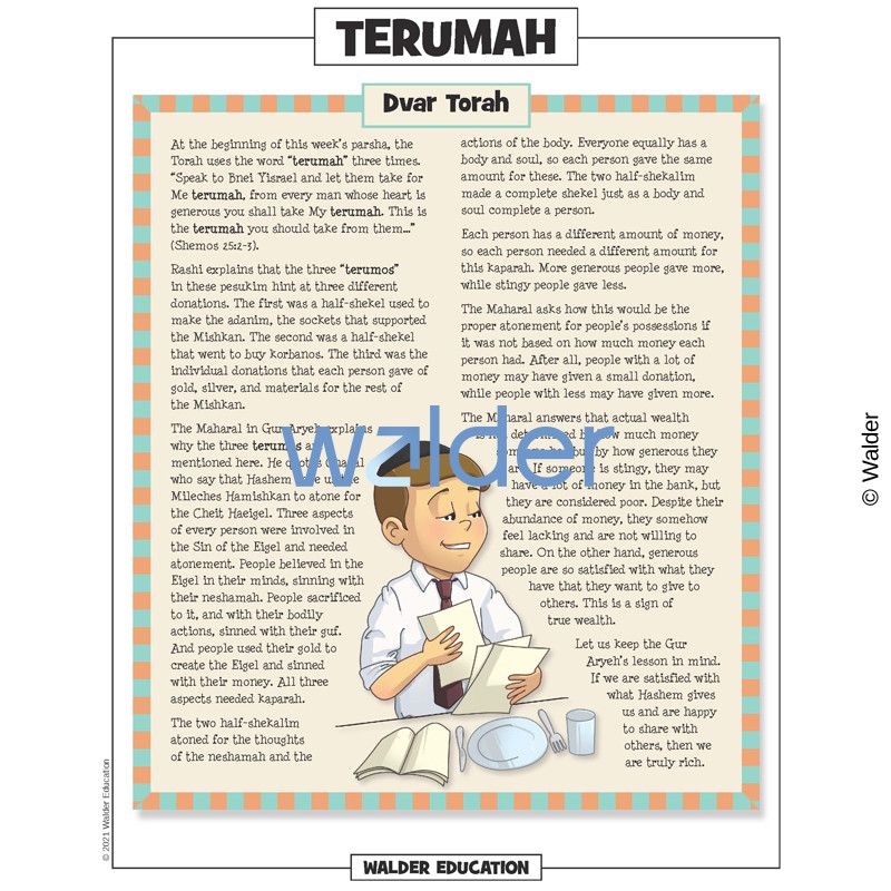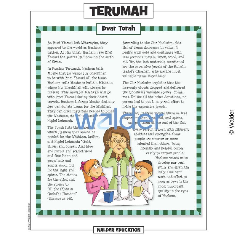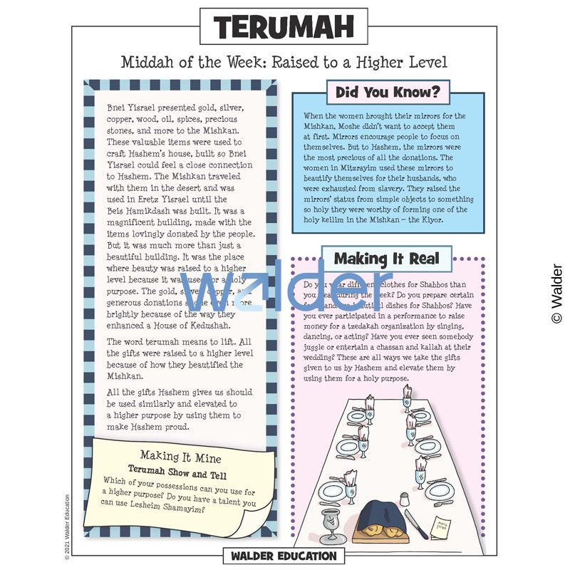 This handout is filled with everything needed to review the weekly parsha at the Shabbos table. It contains a summary of the weekly Torah portion, a middah of the week, and divrei Torah that are sure to engage children of all ages.