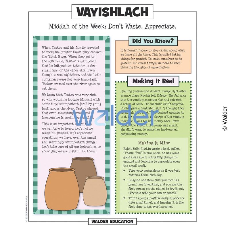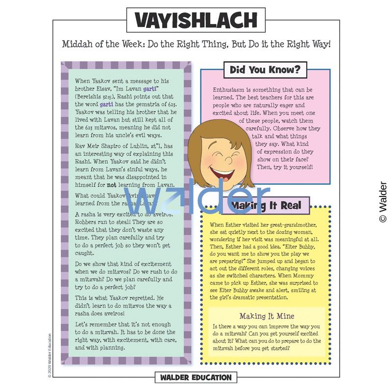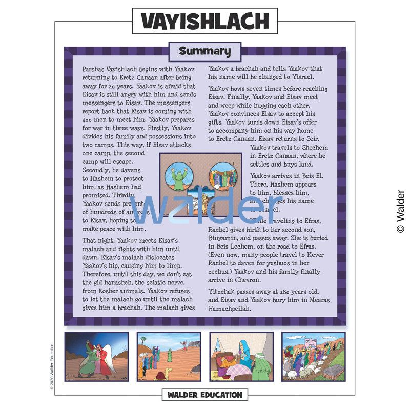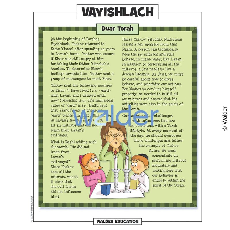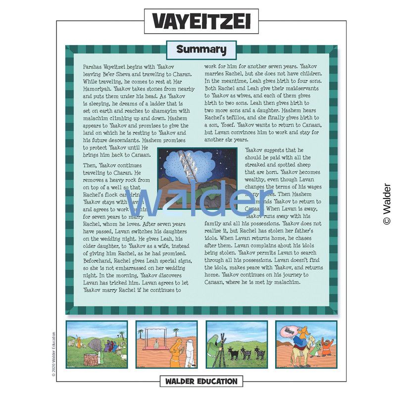 This handout is filled with everything needed to review the weekly parsha at the Shabbos table. It contains a summary of the weekly Torah portion, a middah of the week, and divrei Torah that are sure to engage children of all ages.