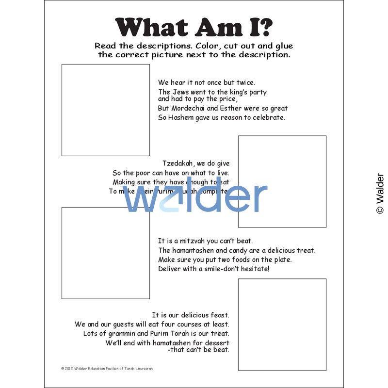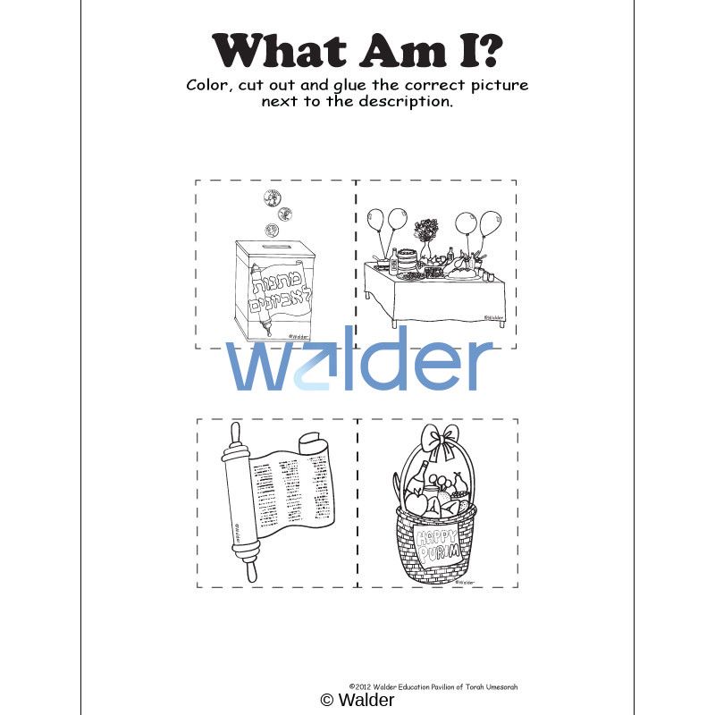 Activity sheet that reinforces and reviews the four mitzvos of Purim; Megilla, Matanos Leevyonim, Mishloach Manos and Mishte. Students will read the descriptions of each iten, color, cut out and glue the correct picture next to the description. Possible Uses: 1. Teachers will use this as an activity to reinforce information already taught. 2. Teachers will use this as an assessment tool to see if students learned the information already taught.