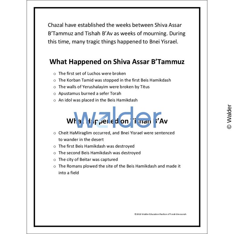 A Summary of historical events that took place on Shiva Assur B’Tammuz and Tisha B’Av. Possible uses: Teachers or counselors will review historic events that took place on these days.