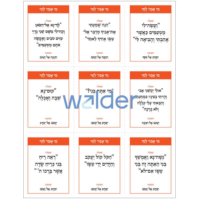 Actively involve your students in reviewing Chumash with these versatile flashcards, featuring review questions from Parshas Toldos. Each card includes a quote from the parsha, asks who said it and to whom (מי אמר למי), and provides a corresponding answer, enabling students to confidently quiz a partner.