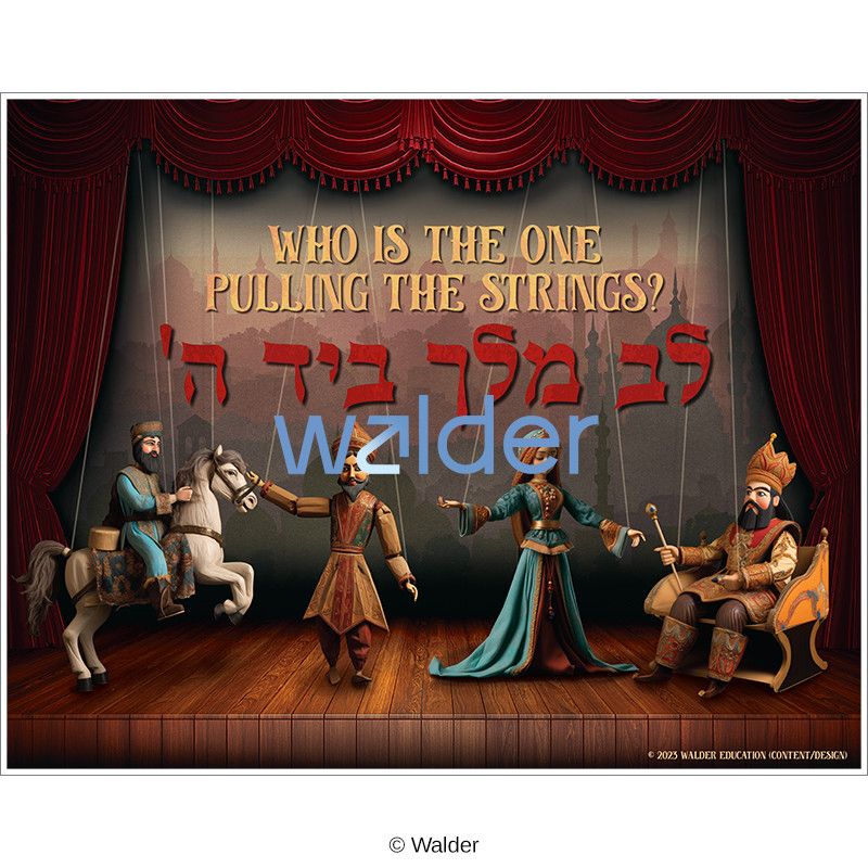 Give your students a deeper understanding of Hashem’s role in the Purim story and the world at large with this intuitive, visually appealing poster. Characters from the Purim story are depicted as marionette-style puppets controlled by unseen hands. The text on the poster asks, “Who is the one pulling the strings?” and answers, “ ‘לֶב מֶלֶךְ בְּיַד ה” , the heart of the king is in Hashem’s hands (Mishlei 21:1). Use this poster to discuss this concept, its connection to the Purim story, and to generate discussion about the role of Hashem in guiding world affairs.