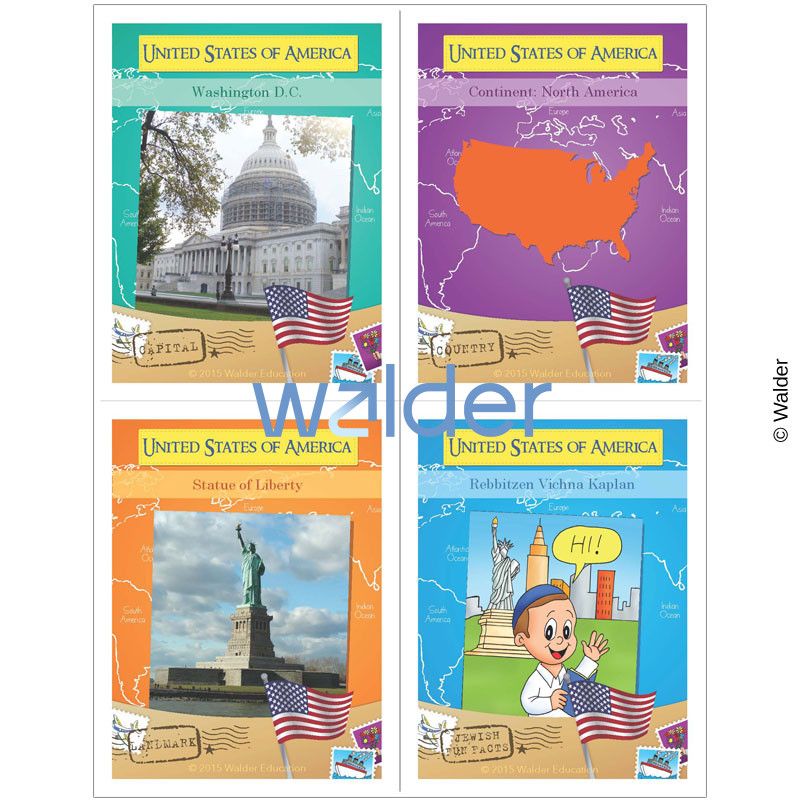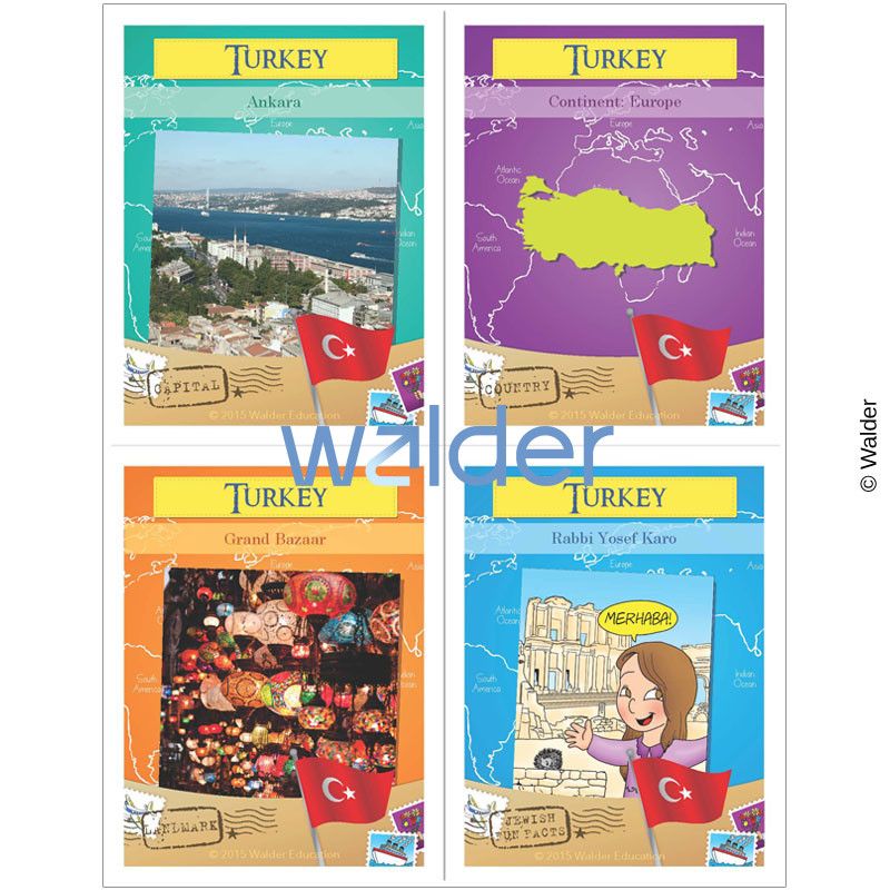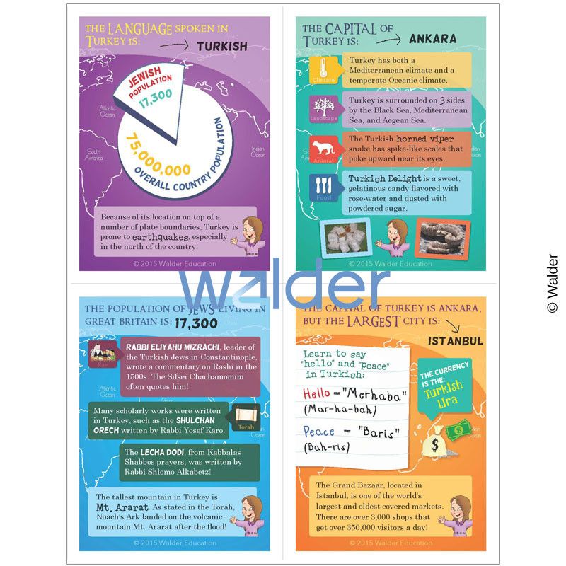 The world geography cards are a glimpse into many countries in different continents around the world. There are four cards appropriated for each country each highlighting facts about the population, natural environments, landmarks, food, currency and each set has a card featuring historical and current information about Jews. Used in conjunction with our world map, students will get a glimpse of Jewish Life and Geography around the world. The full set of trading cards encompasses an assortment of 48 countries.