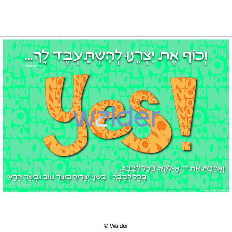 Along with his yeitzer tov and yeitzer hara, a person is affected by both positive and negative situations and choices. Our job is to channel the yeitzer hara, the negative, into positive actions and attitudes. This poster points out that we must make the nos that surface in our lives into yeses. Additionally, this concept can be taught in conjunction with units on Birchos Hashachar, Shema, and Gemara Brachos 54.